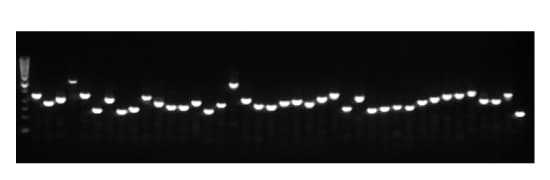 A random set of 94 clones from a human cDNA library was amplified from bacterial colonies. The amplicon sizes varied between 1 and 3 kb. The PfuUltra II Fusion HS DNA Polymerase amplified 91 of 94 randomly selected clones (97%) with high yields and a fast cycling time.