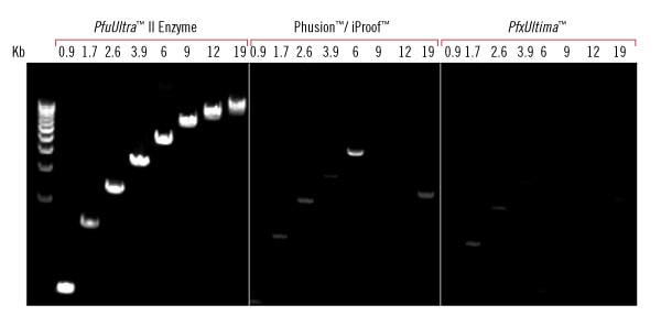 The PfuUltra II Fusion HS DNA Polymerase amplifies a broad range of genomic DNA targets up to 19 kb in length. In contrast, other commercial enzymes exhibit limited target-length capability.