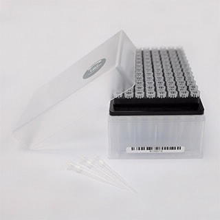 - 250 μL sterile, filtered, pipette tips are available in a barcoded rack for enhanced traceability
