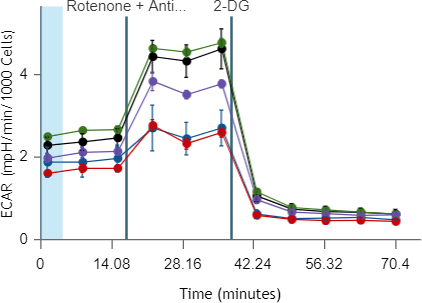 These data represent uncorrected ECAR (driven by both glycolysis and mitochondrial respiration) before glycolytic PER quantification.