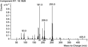 The first component the chemicals encounter in the mass spectrometer is called the ion source, where neutral molecules that elute from the GC column are ionized. A common ion source is an electron ionization (EI) source that usually contains a metal filament, similar to the filament in a light bulb. When an electrical charge is applied to the filament, it emits a stream of electrons at the incoming compounds, breaking them into fragments, and many of them with a positive charge. The pattern of resulting fragments acts as a highly specific “fingerprint” that can be used to identify the chemical.