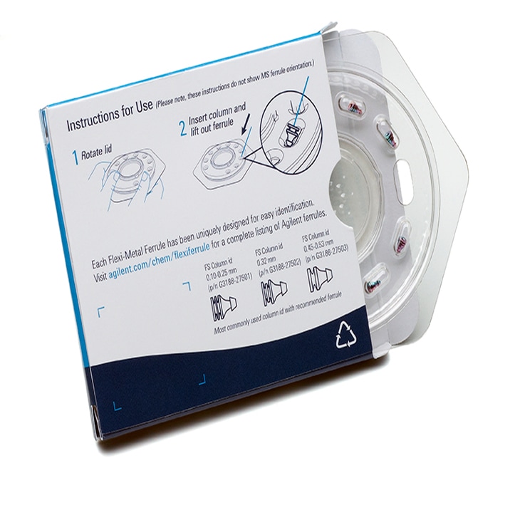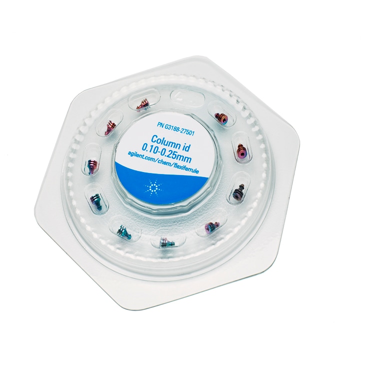 Agilent UltiMetal Plus and gold-plated Flexible Metal ferrules are composed of stainless steel and coated to ensure complete inertness. Their unique mechanical design ensures a tight-leak free connection.  Each sized Flexible Metal ferrule is uniquely designed to prevent inventory mixups, and to help you find the ferrule you need quickly.