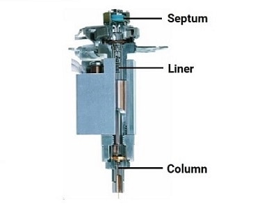 The inlet is the most complex part of many gas chromatography instruments. When analyzing liquids, samples are typically injected through a septum into the inlet using a syringe. An SSL inlet, as shown here, vaporizes the sample at temperatures up to 350 °C inside a glass liner. The liner provides an inert surface during vaporization to prevent the decomposition of active compounds in the sample that can be catalyzed by hot metal surfaces. The liner can also be packed with deactivated glass wool for more efficient vaporization and incorporate different internal geometries and baffles to increase mixing and homogenization of the sample vapor.
