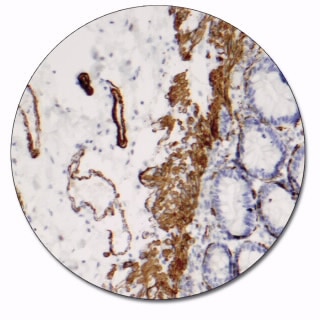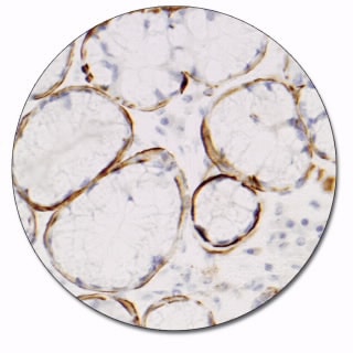 Labels myocardial, skeletal and smooth muscle cells as well as myoepithelial cells. It also reacts with 'myofibroblasts' in the stroma of certain tumors. The antibody is a useful aid for classification of rhabdomyosarcomas, leiomyomas and leiomyosarcomas, and many carcinomas.