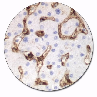 In tonsil, the crowded and isolated T-helper cells show a moderate to strong staining reaction. In liver, the Kupffer and endothelial cells of the sinusoids show a weak to moderate staining reaction.