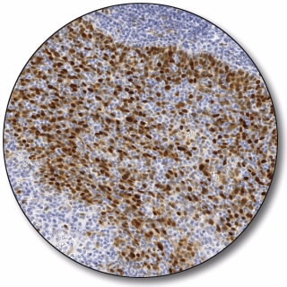 This monoclonal rabbit antibody reacts with cyclin D1, a 36 kDa protein encoded by the CCND1 (bcl-1) gene located on chromosome 11q13. Cyclin D1 is part of the cell cycle regulation and oncogenic transformation in mammalian cells. The cyclin-dependent kinases, CDK4 and CDK6, are associated with and activated by cyclin D1 thereby promoting G1 phase progression by retinoblastoma protein phosphorylating along with related proteins. Antibodies to cyclin D1 are a useful aid for classification of mantle cell lymphomas in the context of lymphoid tumors (1-2).