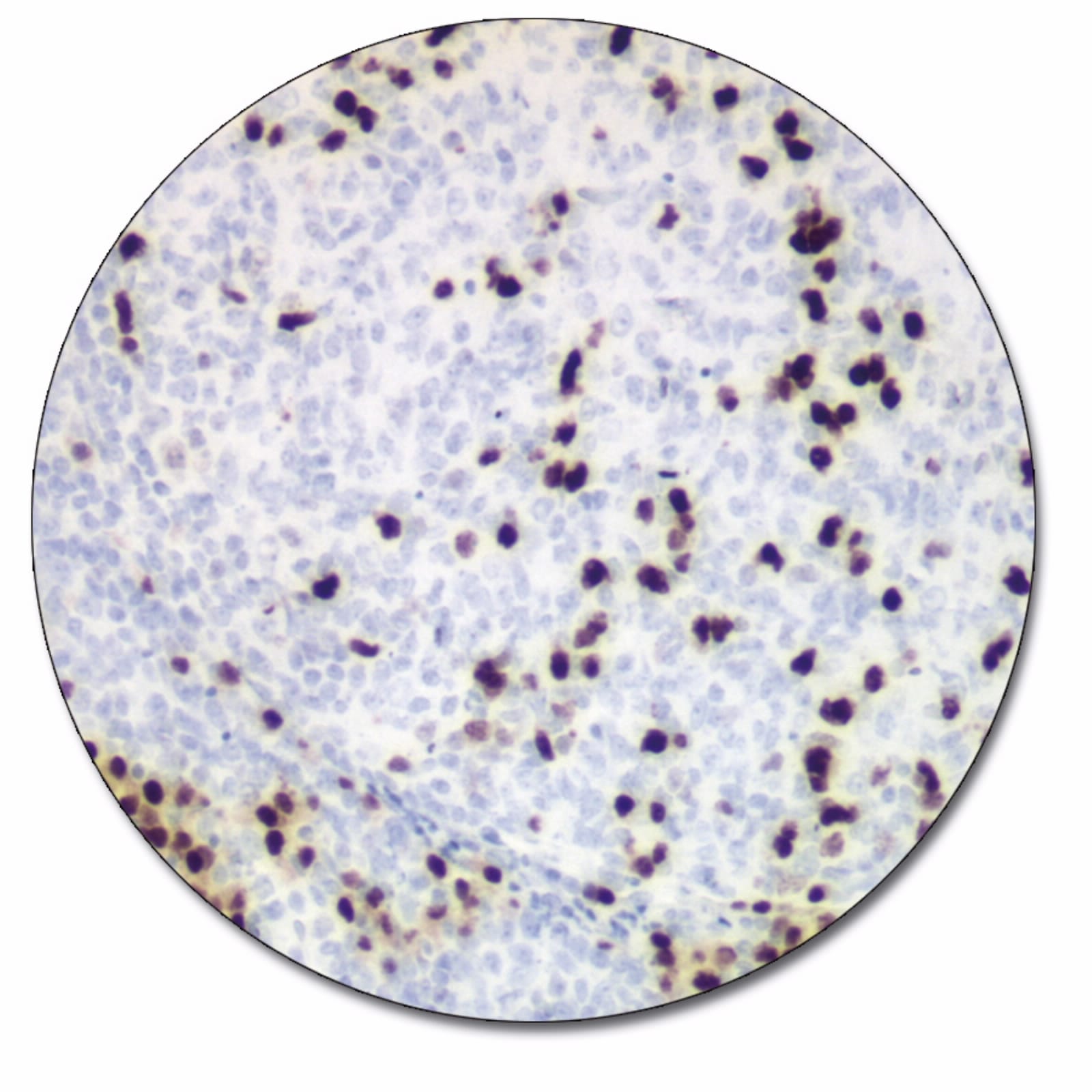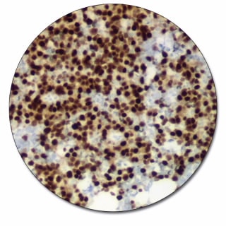 Labels MUM1 protein in a subset of light zone germinal centre (GC) B cells (probably centrocytes and their progeny), plasma cells and activated T cells. Antibodies to MUM1 protein are a useful aid for classification of a wide spectrum of hematolymphoid neoplasms derived from these cells. Of non-hematolymphoid neoplasms only a proportion of melanomas are labeled (1, 2). Antibodies to MUM1 protein are a useful aid for subclassification of B-cell lymphomas (1-3).