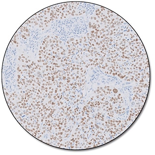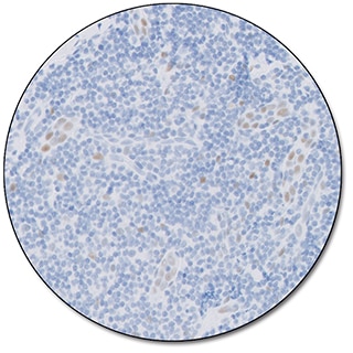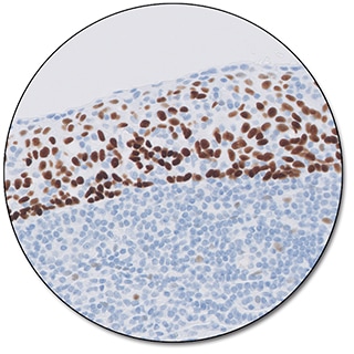 The new clone DAK-p63 is raised against a synthetic peptide derived from the core DNA-binding domain of human p63 protein thus reacting with TAp63 and ΔNp63 isoforms of p63.
