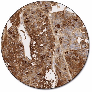 Thyroglobulin is the precursor of thyroid hormones. It is synthesized by thyrocytes and transported to the apical surface where it is secreted into the lumen of thyroid follicles and stored as the major component of colloid. The antibody is useful for the detection of thyroglobulin in thyroid tissue and is a useful aid for classification of well-differentiated thyroid carcinomas.