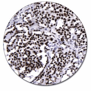 WT1 is a gene involved in the induction of Wilms' tumor, a pediatric renal malignancy. Wilms' tumor 1 protein regulates transcription of other genes and can function both as a transcriptional activator and repressor. The antibody reacts with all isoforms of the full-length WT1 and also identifies WT1 lacking exon 2-encoded amino acids. Results aid in the classification of Wilms' tumors, malignant mesotheliomas and acute leukemias.