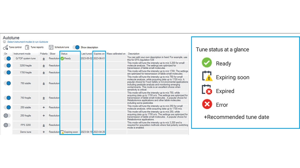 In the world of high-end LC/MS, there are many different ways to tune an instrument, depending on the application focus of the lab. The Agilent SWARM autotune allows instruments to be tuned for specific applications and desired performance. Auto- and check tunes can be scheduled to run during downtime so that the instruments are always ready to go. Smart tuning provides peak instrument performance, greater instrument consistency, and faster startup time.