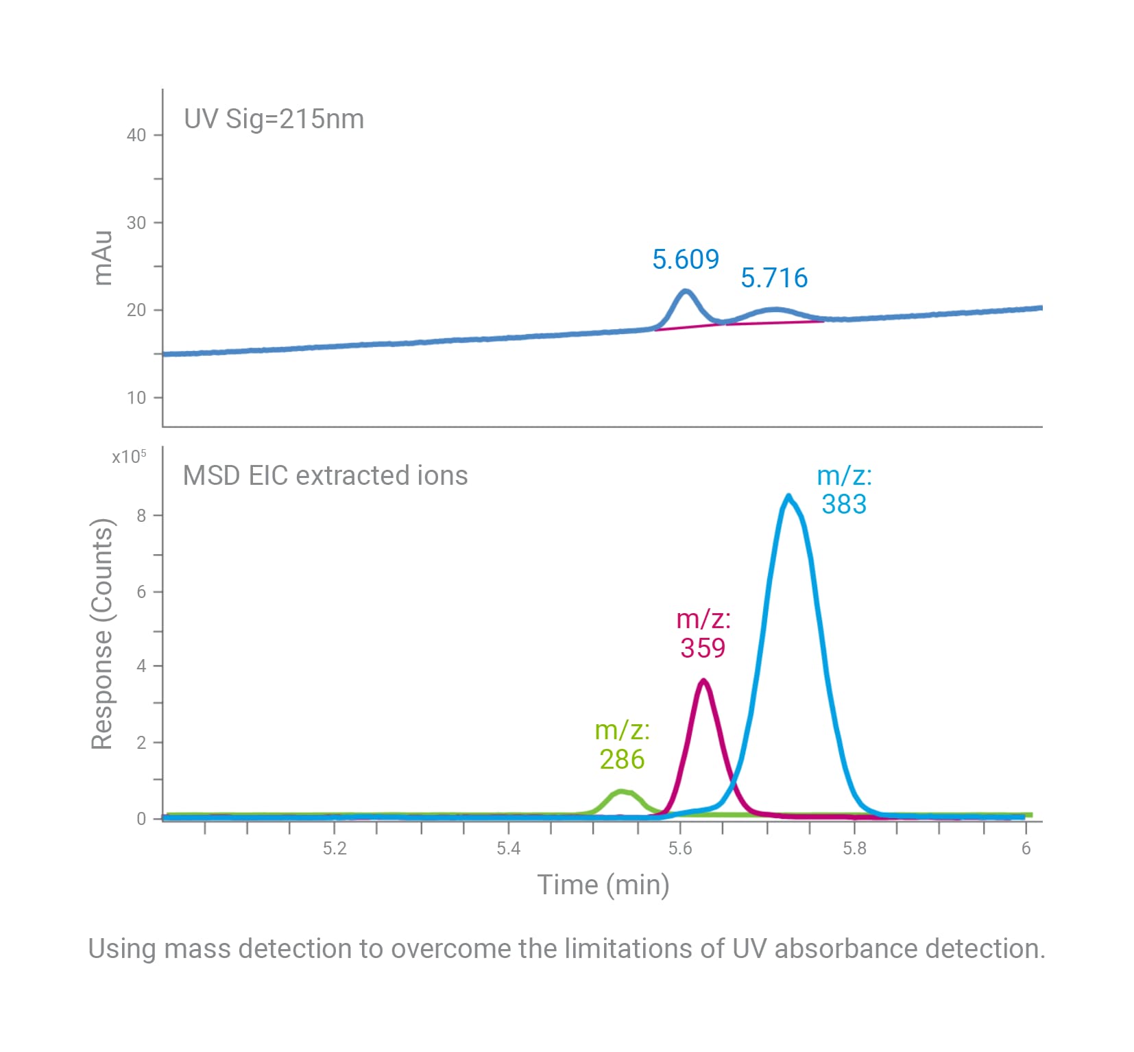 Using mass detection overcomes the limitations of UV absorbance detection. In this example, the mass spectrometer reveals an additional compound not resolved via UV analysis.