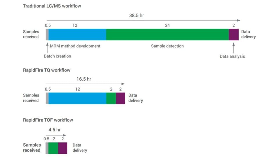 High-throughput mass spectrometry (HTMS) is useful when hundreds or thousands of samples need to be analyzed in a short period. The limiting factor for throughput is often the chromatographic separation performed before MS analysis. To speed up LC separation, analysis times can be shortened through appropriate method choices (gradient, flow rate, column packing, and so forth). However, traditional LC/MS analyzes samples serially, which can leave a mass spectrometer idle and underutilized.
