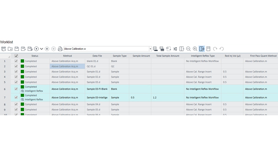 Intelligent reflex is a smart algorithm that automatically reinjects samples based on answers provided by quantitative mass spectrometry data analysis software. This algorithm enhances data quality in real time and dramatically increases throughput through several logic-based workflows. These sample reinjection protocols boost efficiency in high-throughput and routine laboratory scenarios for LC/TQ and LC/(Q)-TOF users. Users can also improve identification confidence with two LC/Q-TOF-only intelligent reflex workflows. All workflows assume that there is a normal, routine worklist structure with QCs, blanks, and samples. The workflows use MassHunter Quantitative Analysis methods, pre-established calibration curves, and outlier thresholds combined with hardcoded rules to prevent carryover and allow users to follow their laboratory standard operating procedures. Reinjections added as a result of intelligent reflex workflows are visible at a glance.