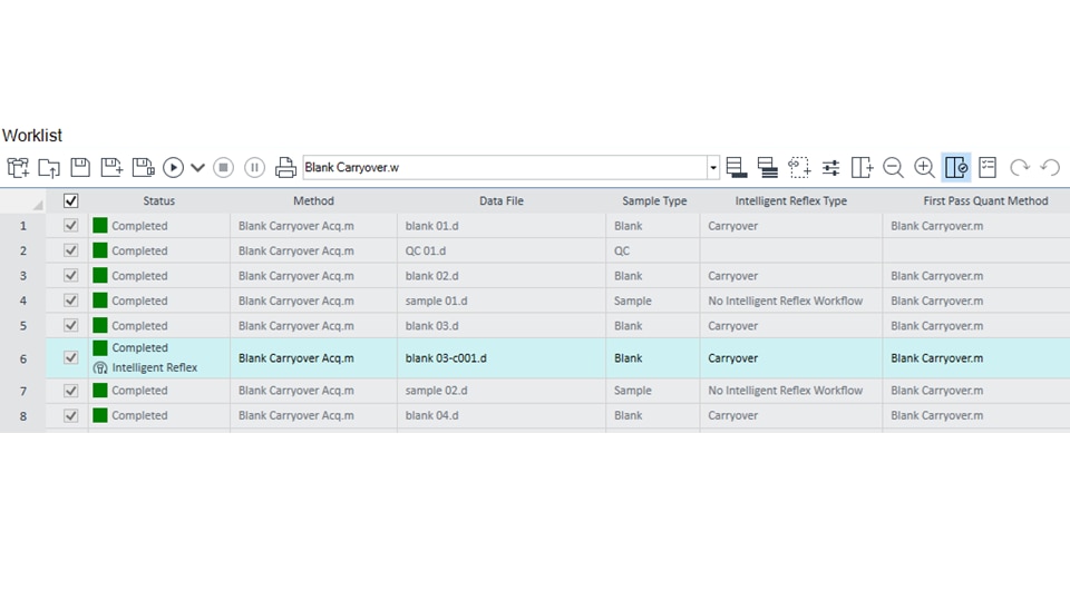 The intelligent reflex carryover detection workflow prevents carryover from contaminating multiple samples in a worklist. If carryover is detected, the system will inject up to a user-defined maximum number of blanks to attempt to overcome the contamination. The user can choose to pause the worklist if carryover is still detected after the maximum number of blank reinjections have been acquired. When carryover is no longer detected or not present, the worklist continues as scheduled.