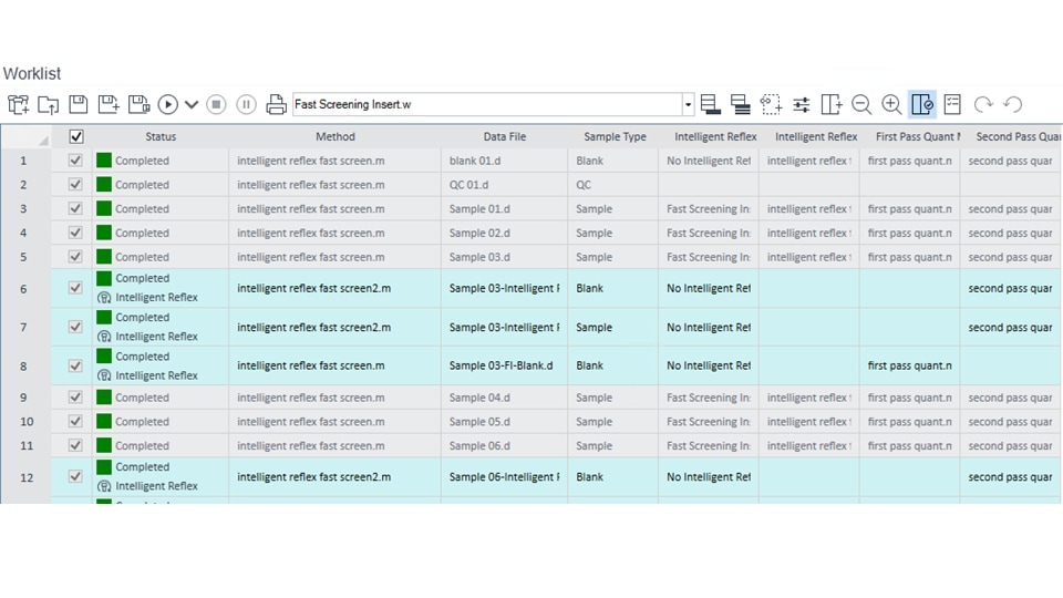 Intelligent reflex fast screening workflows are used to confirm a presumptive positive. These workflows boost productivity and save time for worklists where there is a low expected number of positive samples. For example, in forensic toxicology samples, there is likely an expectation that most samples will be clean, with a low percentage of samples returning positive results. Fast screening workflows typically use two different acquisition and quantitative methods. In this scenario, the first-tier method is fast, often a ballistic gradient. This fast method is used to rapidly screen all samples. If a run positively detects a target analyte, that sample is re-analyzed using a longer method for true confirmation. Learn more about applying the fast screening workflow.