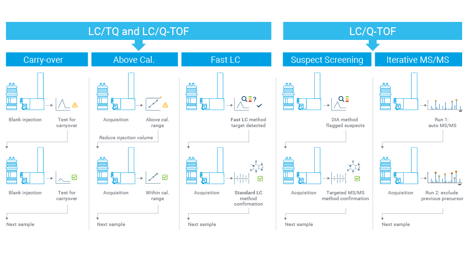 The latest generation of LC/TQ and LC/(Q)-TOF instruments offers a suite of intelligent automation features to reduce the burden of manual intervention and keep the instruments at peak performance. Software predictive tools not only help to reduce the time users need for troubleshooting, but also help prevent costly downtime, and unexpected maintenance issues, and prolong the lifespan of the equipment. New workflow intelligence capabilities, such as intelligent reflex workflows are a feature of MassHunter software and are designed to save time while also reducing the burden on analysts. These workflows aim to reduce manual intervention, increase lab productivity, and avoid sample reruns.