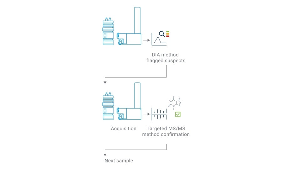 The targeted MS/MS confirmation workflow is available for LC/Q-TOF instruments and confirms compounds that were screened as questionable or present during untargeted screening. Two different acquisition and quantitative methods are used for this intelligent reflex workflow. The first-tier method uses All Ions (DIA) data, while the second-tier method uses MS/MS data for confirmation.