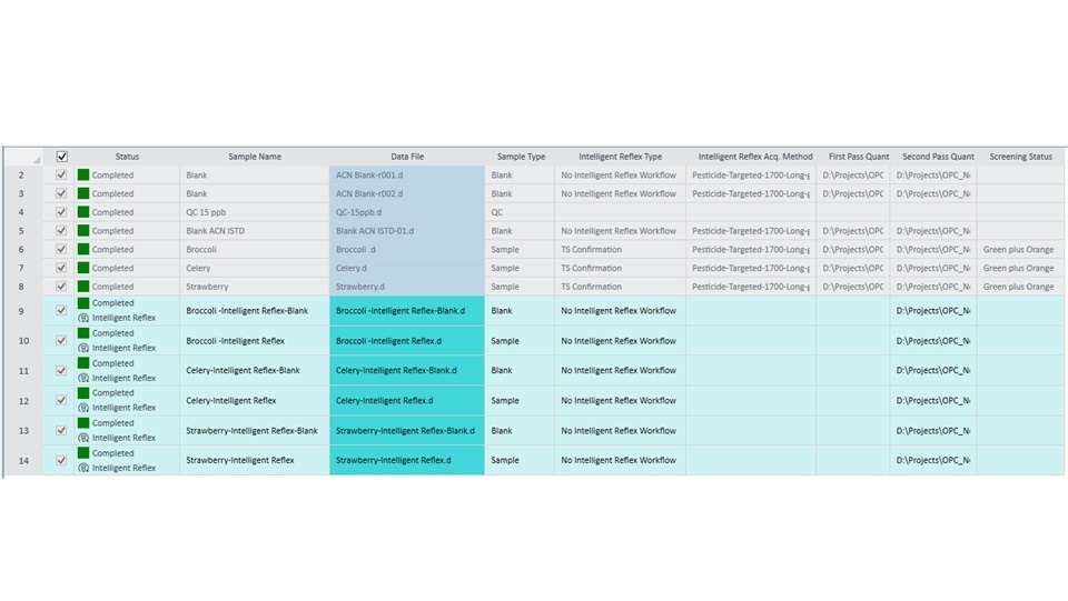 The screenshot shows how the targeted reinjection was appended to the running worklist along with a QC and blank injection. The originally created worklist was completed, followed immediately by the targeted reinjection without manual input by the scientist. Learn more about this workflow used in pesticide screening in food matrices.