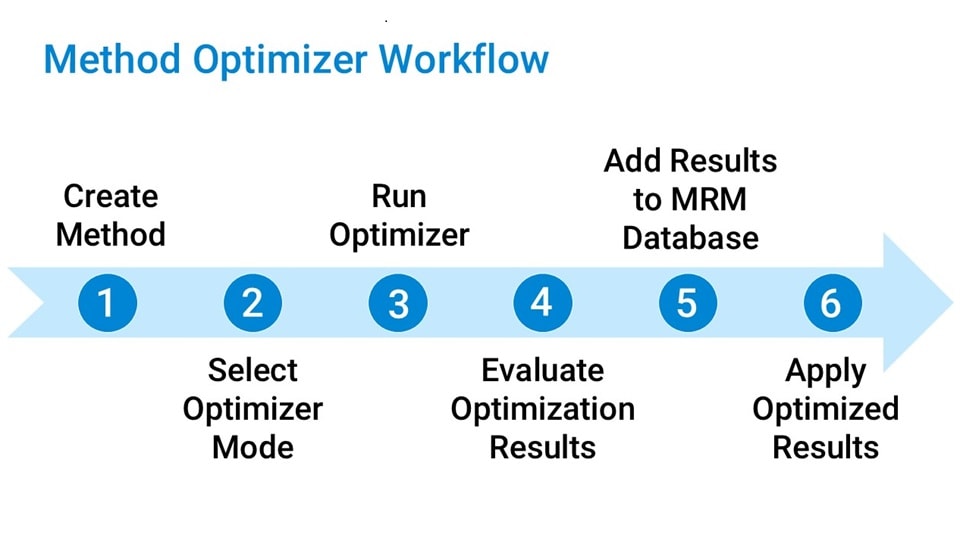 MassHunter Optimizer software is an intelligent software algorithm for end-to-end LC/MS/MS method development, optimization and QA/QC deployment. The Optimizer tool is part of MassHunter 12 and allows users to optimize multiple reaction monitoring (MRMs) transitions and ion source parameters in a fully-automated or semi-automated fashion. Using a modular end-to-end workflow approach, users may input chemical formula information which will result in optimized MRM transitions for each compound and optimal ion source parameters for the overall method.