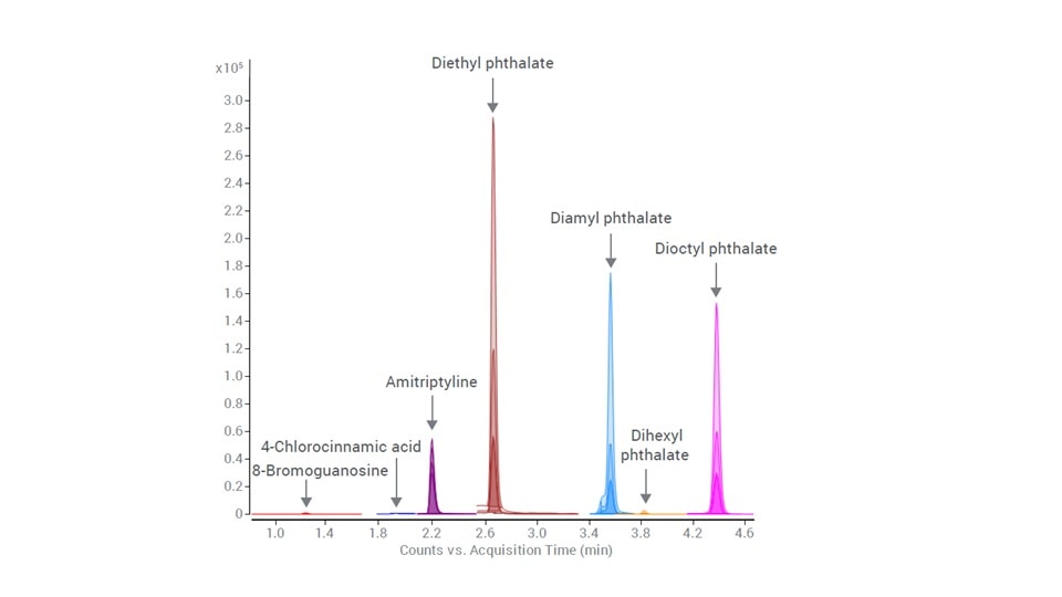 As an example, the image shows a fully optimized seven-analyte standard mixture chromatogram created from scratch. Chemical formulas of the neutral analytes were entered into the method development interface to automatically calculate the potential [M+H]+ or [M-H]- precursor ions. The optimization workflow was performed unattended in two major phases. First, MRM optimization included precursor fragmentor voltage, RT determination (optional) product ion selection, and MRM collision energy voltage. Then, ion source optimization included drying gas temperature, sheath gas temperature, capillary voltage, nebulizer pressure, drying gas flow, sheath gas flow and nozzle voltage.