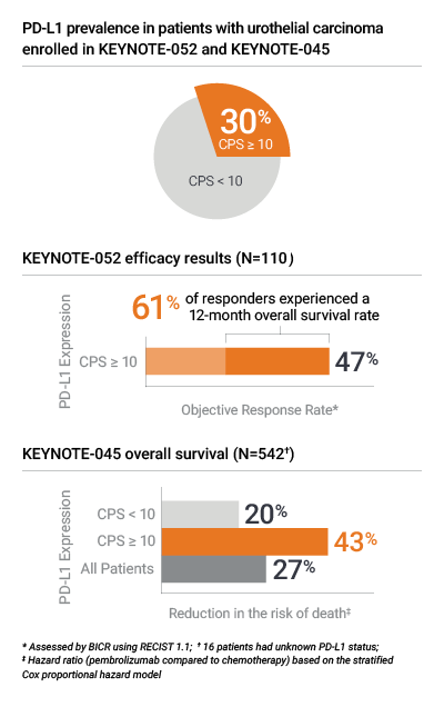Proven in KEYNOTE-052 and KEYNOTE-045 for PD-L1 results in urothelial carcinoma1,2