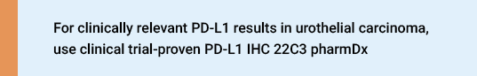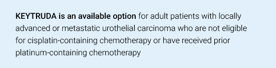 References: 1. PD-L1 IHC 22C3 pharmDx [package insert]. Carpinteria, CA: Dako, Agilent Pathology Solutions; 2019. 2. Keytruda [package insert]. Hoddesdon, UK: Merck Sharp & Dohme Limited; 2019. 3. Antoni S, Ferlay J, Soerjomataram I, Znaor A, Jemal A, Bray F. Bladder cancer incidence and mortality: A global overview and recent trends. Eur Urol. 2017;71(1):96-108. 4. Choueiri TK, Ross RW, Jacobus S, et al. Double-blind, randomized trial of docetaxel plus vandetanib versus docetaxel plus placebo in platinum-pretreated metastatic urothelial cancer. J Clin Oncol. 2012;30(5):507-512. 5. Bellmunt J, Mottet N, De Santis M. Urothelial carcinoma management in elderly or unfit patients. EJC Suppl. 2016;14(1):1-20. 6. Balar AV, Castellano D, O'Donnell PH, et al. First-line pembrolizumab in cisplatin-ineligible patients with locally advanced and unresectable or metastatic urothelial cancer (KEYNOTE-052): A multicentre, single-arm, phase 2 study. Lancet. 2017;18(11):1483-1492. 7. Galsky MD, Hahn NM, Rosenberg J, et al. Treatment of patients with metastatic urothelial cancer "unfit" for cisplatin-based chemotherapy. J Clin Oncol. 2011;29(17):2432-2438. 8. Bellmunt J, de Wit R, Vaughn DJ, et al. Pembrolizumab as second-line therapy for advanced urothelial carcinoma. N Engl J Med. 2017;376(11):1015-1026.