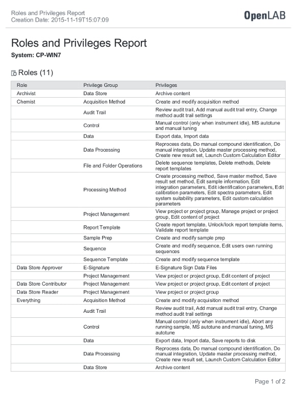 Figure 3 Example of Roles and Privileges Report in OpenLab CDS.