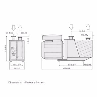 - Dual stage design allows low 10-3 mbar operation, low operating temperature, minimal backstreaming at low pressure, good pumping efficiency and gas ballast in the low 10-2 mbar region