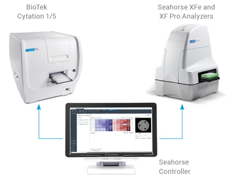 A unified controller, controlling both BioTek and Seahorse instruments, acquires brightfield (before and after XF assay) and fluorescence (after XF assay) images, to calculate cell counts.