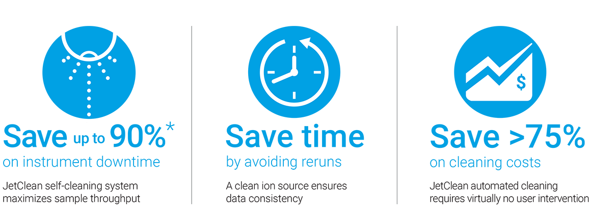 The JetClean self-cleaning ion source eliminates these problems. It uses a carefully controlled hydrogen flow that removes even the most stubborn deposits. That means: