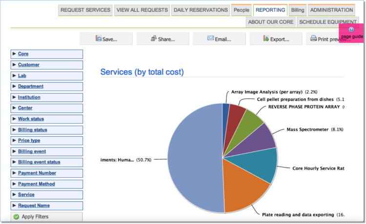 iLab enables dynamic reporting which can be generated from the usage, request, and billing data entered and stored in the system. These reports can be accessed by research administrators to analyze lab activity and spending, by core administrators to view real-time usage, and by institution administrators to analyze utilization across all cores institution-wide.
