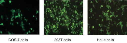 Figure 1: The Renilla reniformis humanized recombinant green fluorescent protein II (hrGFP II) was expressed in a range of mammalian cell types by transfection with the phrGFP II-C vector. Cells were plated at 2.4–6 × 105 cells per well in 6-well plates the day before transfection. Transfection was performed using a cationic lipid reagent at DNA:reagent (w/v) ratios of 1:1.25 (HeLa) and 1:2 (COS-7 and 293T) and incubated for 5 hours. All images were taken with a 10-second exposure time.
