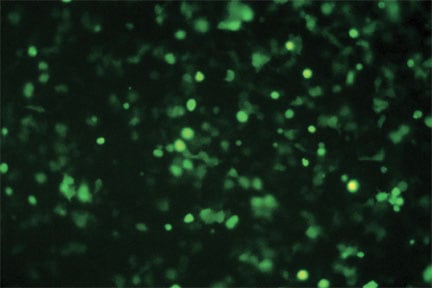 Figure 2: The Renilla reniformis humanized recombinant green fluorescent protein II (hrGFP II) was expressed in 293T cells by transfection with the pIRES-hrGFP II vector. Cells were plated at 6 × 105 cells per well in a 6-well plate the day before transfection. Transfection was performed using a cationic lipid reagent at DNA:reagent (w/v) ratio of 1:2 and incubated for 5 hours. The image was taken 48 hours post transfection with a 10-second exposure time.