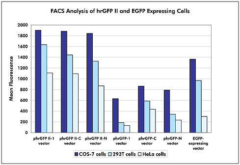 We have expressed the hrGFP II in a wide range of human, rodent, and simian cell lines (see Figures 1 and 2), and observed levels of fluorescence higher than that for the red-shifted, humanized variant of Aequorea GFP (EGFP) in all cell-types tested (see Figure 3). In addition, stable GFP-expressing cell lines are produced much more efficiently using the Agilent hrGFP compared with EGFP, since Aequorea GFP is often cytotoxic when expressed at low levels.