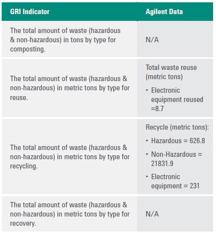 - Agilent’s material management practices are based on the principle of Reduce, Reuse and Recycle for products sold and packaging material utilized. For example, during the reporting period, at one operation we started to replace foam packaging to recyclable PET (polyethylene terephthalate) cell packaging for Gas Chromatography columns. As a result, packaging material weight was reduced on average by approximately 20 percent. At another manufacturing location, we began utilizing the High Recycled Content (HRC) foam for packaging, resulting in positive environmental impact and material/freight savings. The HRC foam is constructed using up to 65 percent recycled PE material. The conventional foam used previously could only use up to 15 percent recycled PE material. At the same time, the robust construction of the HRC foam has allowed us to protect the product using less material, thus reducing the overall packaging size by more than 30 percent. By using recycled content in the HRC foam, we are benefiting the environment by reducing the amount of material that enters the waste stream. Agilent also deployed a Migration of Support strategy that recycles instruments from trade-in programs to continue legacy support for mature equipment that customers want to maintain. This strategy minimizes our environmental impact of building new components while continuing to provide support on older technology.