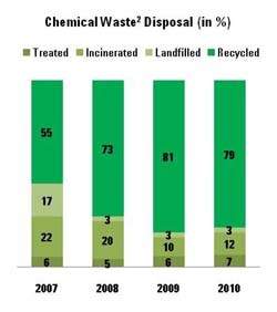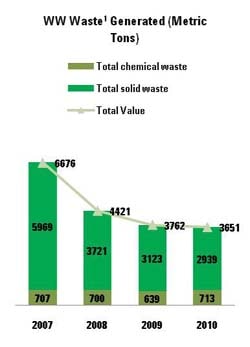 1 Total waste produced is calculated by adding total chemical waste and total solid waste tonnage. Solid waste quantities have increased significantly in 2010, accounted by the large scale construction project at the Santa Clara, California site.