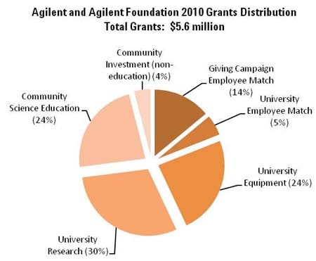 In 2010, Agilent and the Agilent Foundation provided $3.4 million in university grants supporting science and technology research at the forefront of electronic and bio-analytic measurement technologies. In addition, $1.2 million in pre-university science education grants supported programs reaching more than 6,500 educators and 580,000 students worldwide. In total, Agilent and the Agilent Foundation invested $5.6 million in philanthropic cash and equipment during 2010.