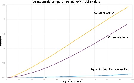 In genere, l'uso delle colonne WAX a temperature pari o superiori alla loro temperatura operativa massima può danneggiare la fase stazionaria, causando problemi di stabilità del tempo di ritenzione. Ora però, grazie a un’innovativa tecnologia delle colonne WAX, è possibile superare questo limite.