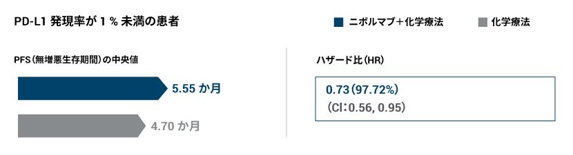 CHECKMATE-227 試験のパート 1b では、PD-L1 発現率が 1 % 未満の化学療法歴のない切除不能な進行・再発の非小細胞肺癌患者において、ニボルマブと化学療法の併用療法は化学療法に対して無増悪生存期間を有意に延長することが示されました。