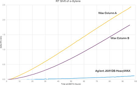 일반적으로 WAX 컬럼을 지정된 최고 운용 온도 이상에서 사용 시 고정상이 손상되어 머무름 시간 안정성에 문제가 생길 수 있습니다. 하지만 이제 혁신적인 WAX 컬럼 기술은 이러한 한계를 극복하였습니다.
