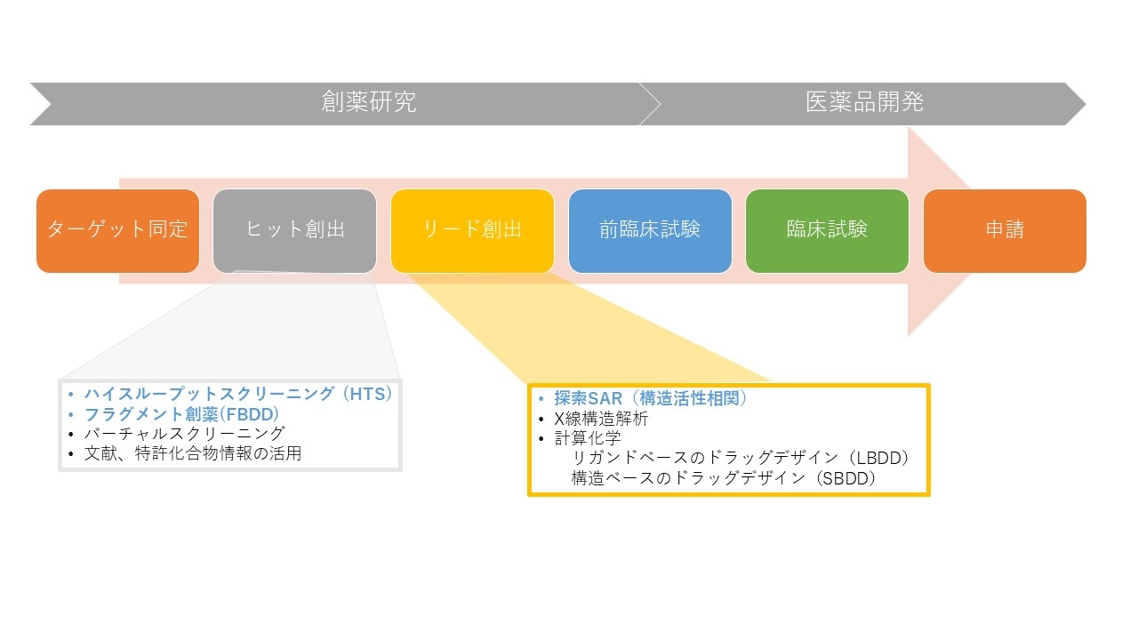 一般に、新薬の開発は、創薬ターゲットを決めること(ターゲット同定)からスタートします。これは、たとえば、疾患に関連するたんぱく質を選定するなど、創薬の標的となる分子を決めることです。近年はAI(人工知能)を活用してターゲットを選定することもあります。次は、薬理活性を示す化合物を見つけるヒット創出です。ヒット創出には、文献や特許化合物情報を活用する方法やコンピューターによるシミュレーションを活用する方法にくわえて、選定したターゲット(たんぱく質など)に対しての結合や阻害など、薬理活性を示す化合物を、ライブラリに登録された何十万、何百万もの化合物の中から見つけていくランダムスクリーニングなどがあります。そして、得られたヒット化合物を最適化し、テーマにもよりますが、細胞や動物で効くレベルにまで仕上げていくのがリード創出です。こうして得られた化合物をリード化合物と言います。いわば、新薬の「原石」とも言える化合物です。その後、さらにリード化合物の構造を最適化して、活性や安全性を高め、前臨床試験、臨床試験へと進んでいきます。