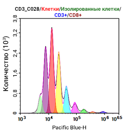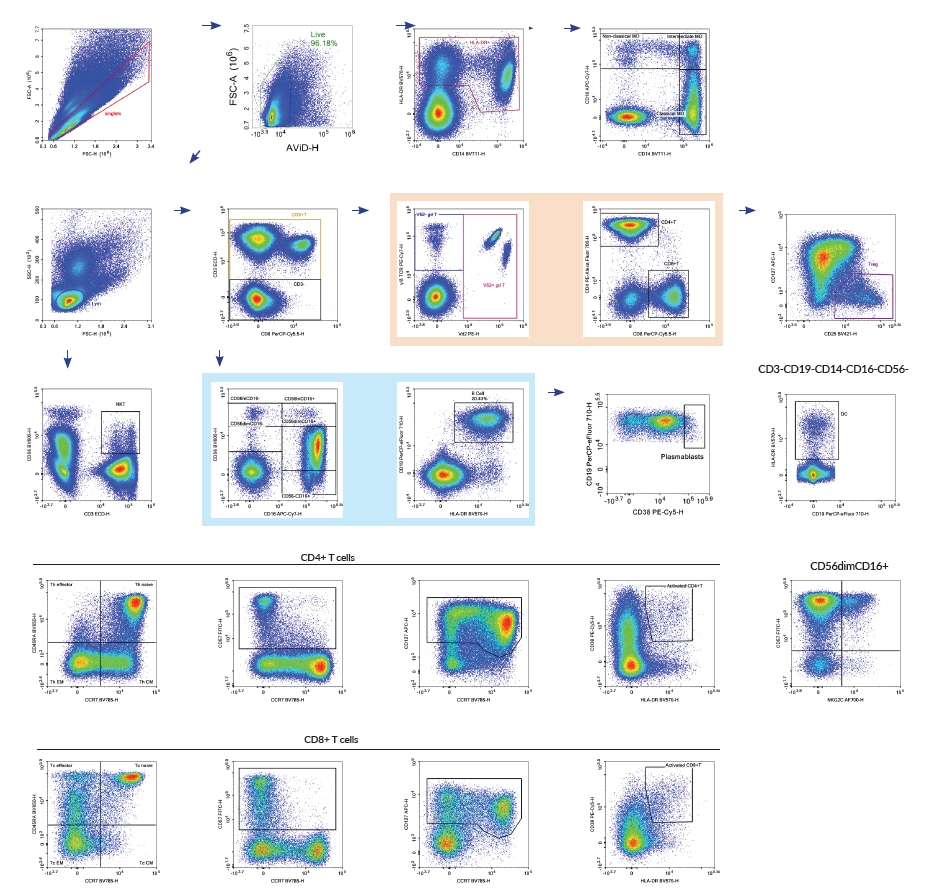 Справа показана 18-цветная панлейкоцитарная панель иммунофенотипирования на МКПК с применением NovoCyte Quanteon. Эта панель была разработана для мониторинга различных иммунных субпопуляций с маркерами активации и дифференциации.