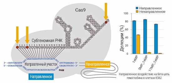 Возможности персонализации, включая способность добавлять модификации для повышения стабильности и специфичности и получения более единообразных результатов. Например, добавление одной модификации в положение 5 или 11 последовательности направляющей РНК бета-цепи гемоглобина существенно снизило уровень ненаправленной активности при сохранении высокого уровня активности на направленном участке.