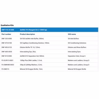 Obsolete. Replaced by DNF-915-K1000. Fragment Analyzer system kit for genotyping and qualitative analysis of PCR amplicons, microsatellites, and SSR's from 35 to 5000 bp. Includes reagents necessary for running 500 samples.